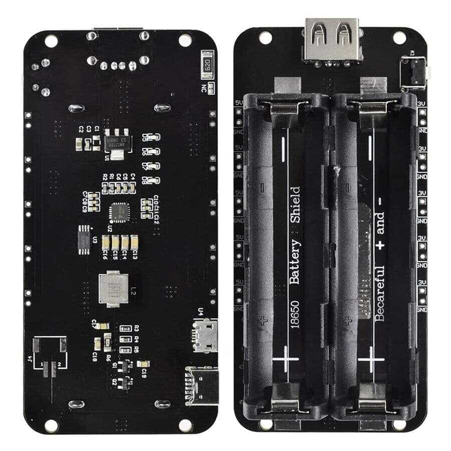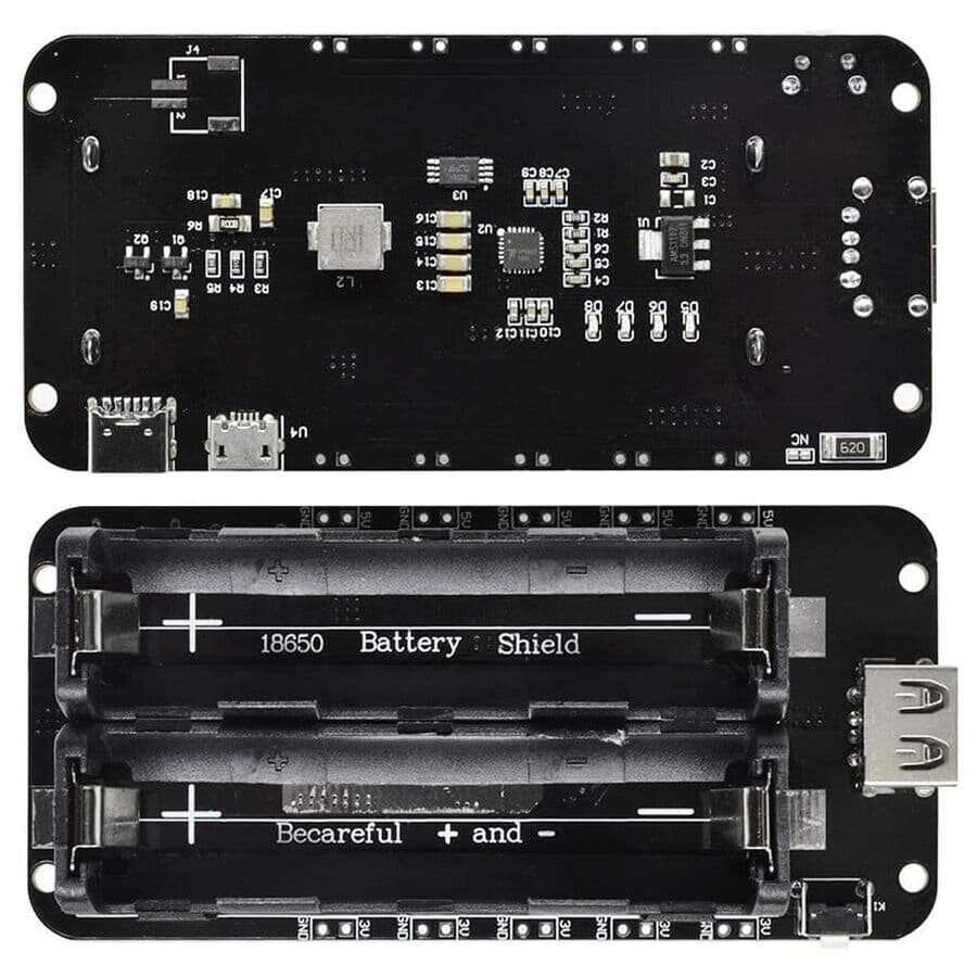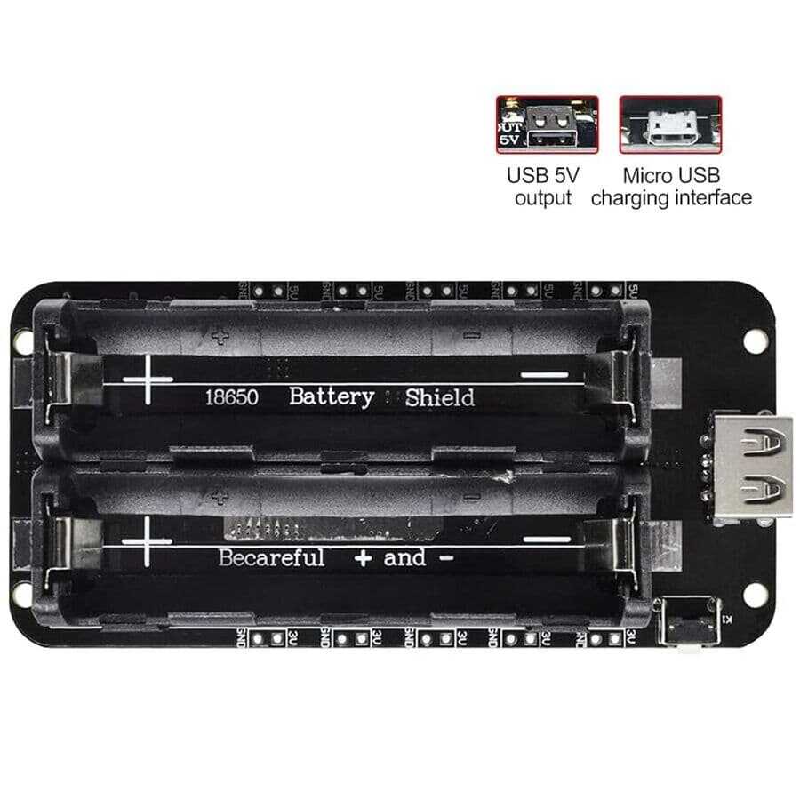 Notify me when its in stockThe 2-Switch 18650 Lithium Battery Shoe V8 allows you to both charge and use 2 18650 Lithium batteries. It has 2 charging ports, Micro USB and USB Type-C, in its ergonomic black design. The module has output values of 3V/1A and 5V/2.2A. The 5V output supports a maximum current of 3A. Not recommended for overload, otherwise module malfunctions may occur. It is recommended to use 2 18650 Lithium batteries. Micro USB charging current is 600mA.