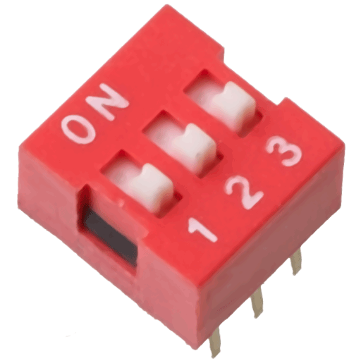 DIP switch with 3 individual switch positions. The pins have 2.54mm spacing - fits great into a breadboard! Works great as general control switches.