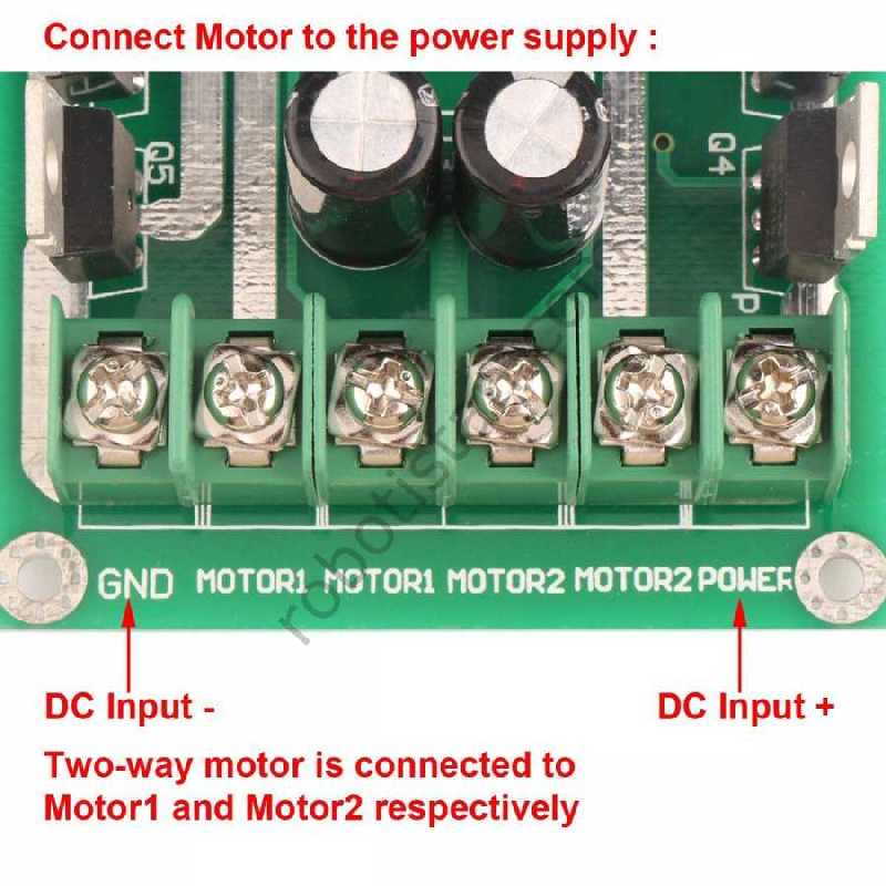 Kart üzerinde yer alan 2 terminalden biri motor ve besleme terminali, diğeri ise kontrol kısmıdır. Motor ve besleme kısmında sırasıyla; GND, MOTOR1, MOTOR1, MOTOR2, MOTOR2 ve POWER kısımları bulunmaktadır.