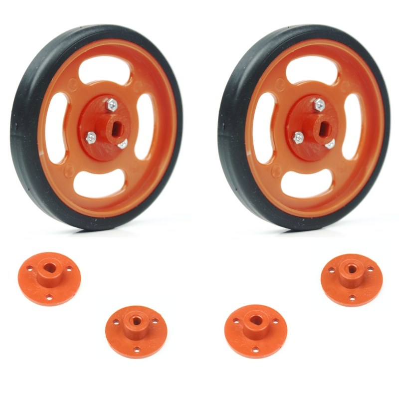 Bu tekerlek seti, robot projelerinizde kullandığınız çeşitli motorlara uyum sağlayacak şekilde tasarlanmıştır. 3mm, 4mm D tipi şaftlı motorlar ve L tipi plastik redüktörlü motorlara uyumlu şaft adaptörleri ile birlikte gelmektedir. Bu sayede bir çok motor ile birlikte kullanma imkanı sunmaktadır.