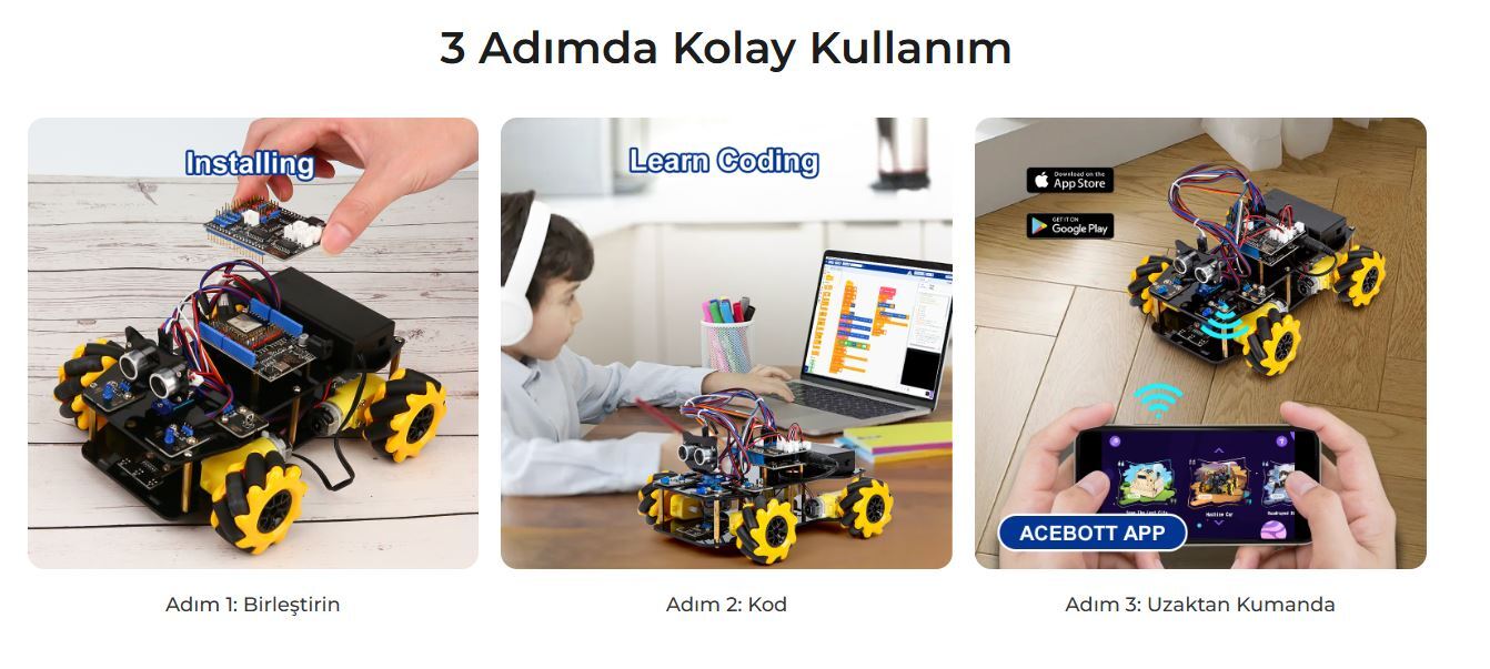 ESP32 Wi-Fi ve Bluetooth desteği sayesinde kullanıcılar robotu mobil uygulamalarla kontrol edebilir. Scratch, Arduino IDE ve Python uyumluluğu sayesinde farklı seviyelerde programlama eğitimine olanak tanır. Kameralı ve servo destekli gimbal sistemiyle görüntü işleme uygulamalarına da giriş yapabilirsiniz.