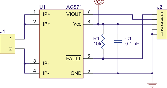 - Use of a Hall effect sensor means the IC is able to electrically isolate the current path from the sensor’s electronics (for applications up to 100 V), which allows the sensor to be inserted anywhere along the current path and to be used in applications that require electrical isolation.