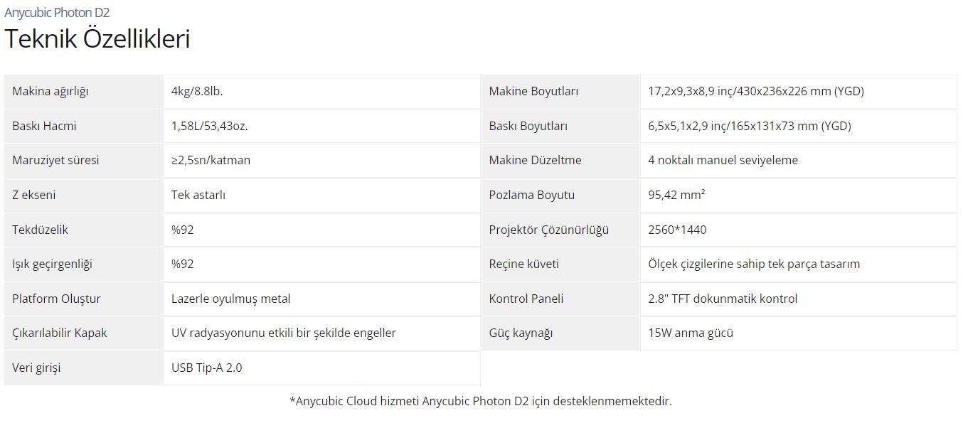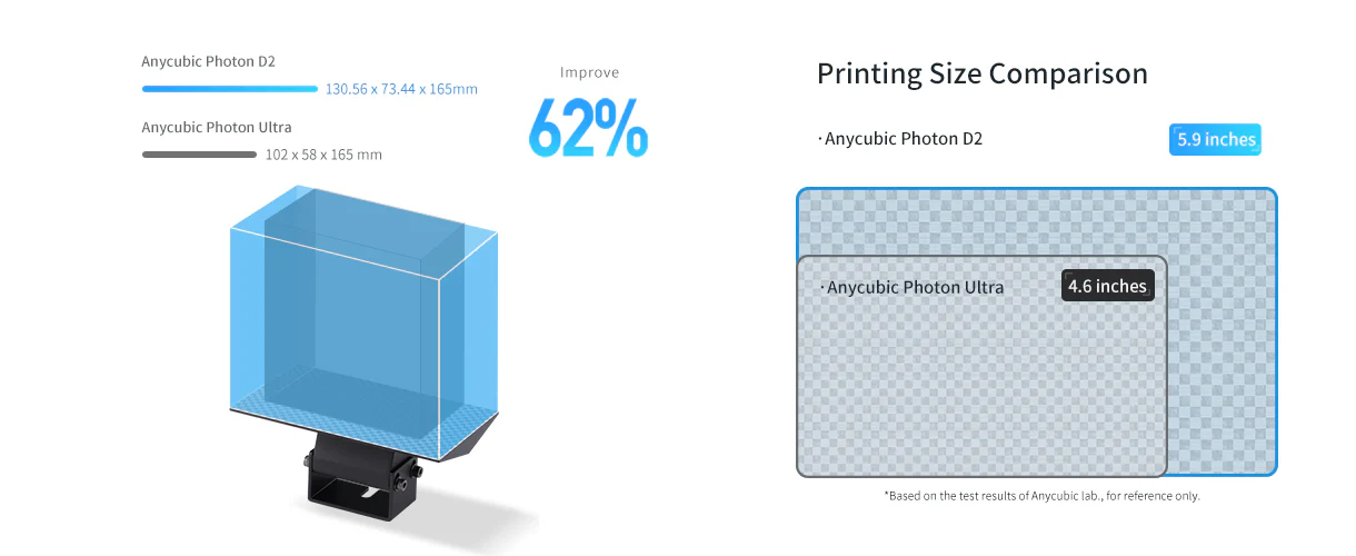 Anycubic Photon Ultra ile karşılaştırıldığında, Anycubic Photon D2'nin baskı hacmi %62 artarak 130,56mm*73,44mm*165mm boyutlarına; baskı alanı ise %55 artarak 95,42cm²'ye ulaşıyor.