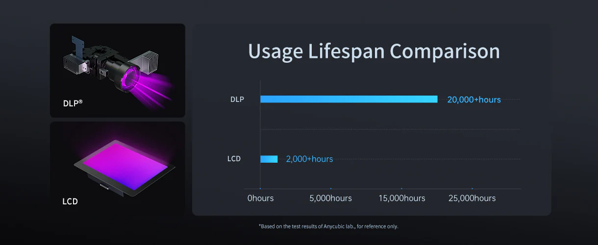 20.000 saat kullanım ömrüne sahip DLP projektör sayesinde, LCD yazıcılarda olduğu gibi ekran başına 2.000 saat kullanım ömrüne sahip ekranları değiştirmenize gerek kalmaz, bu da size önemli miktarda bakım maliyeti tasarrufu sağlar.