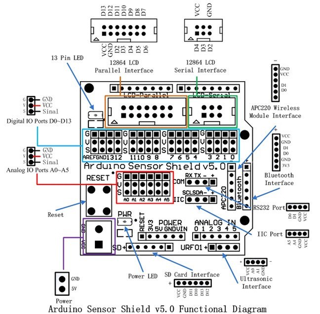 Arduino's all input and output pins on board are in 3-pin sequece in the order of DATA, VCC and GND. Therefore any sensor, servo, relay etc. can be stacked to the board and used easily.