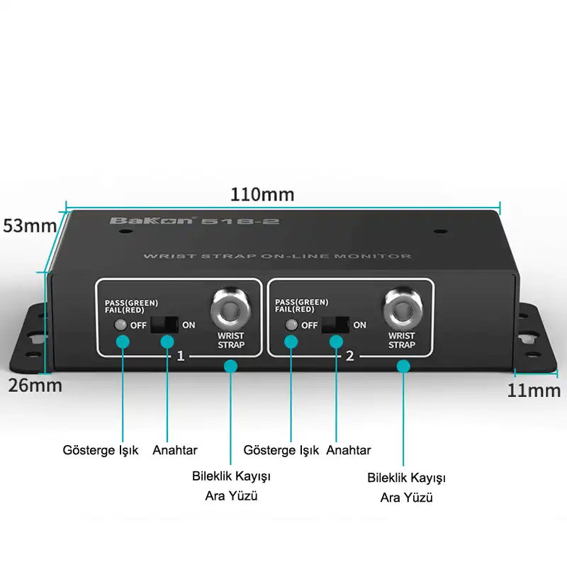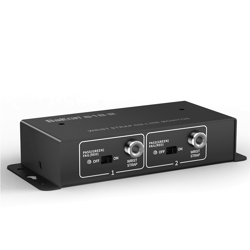 Bakon BK518-2 Bileklik Topraklama Monitör - Çift Giriş, elektronik üretim hatlarında ve ESD (Elektrostatik Deşarj) kontrollü çalışma alanlarında operatörlerin topraklama bağlantısını sürekli izlemek için tasarlanmıştır. Cihaz, aynı anda iki kullanıcıyı destekleyen çift girişli yapısı sayesinde üretim ortamlarında yüksek güvenlik ve verimlilik sağlar. Topraklama bağlantısındaki kopma veya direnç sapmalarını anında tespit eder ve sesli/görsel uyarılarla kullanıcıyı bilgilendirir. Yüksek hassasiyetli algılama sistemi sayesinde statik elektrik kaynaklı hasar riskini en aza indirir ve ESD korumalı alanlarda ideal bir çözümdür.