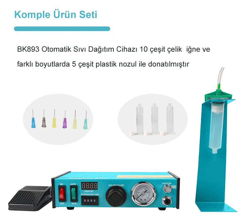 The Bakon BK893 Automatic Liquid Dispenser is a professional device designed for high-precision and repeatable liquid dispensing applications. It ensures controlled dispensing of liquid materials such as solder paste, adhesive, silicone, flux, and oil in electronic assembly, laboratory work, production lines, and R&D operations. Its advanced microprocessor-based control system allows highly accurate adjustment of dispensing time, pressure, and flow rate.