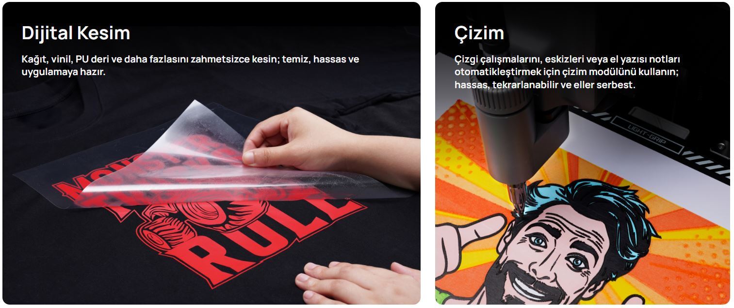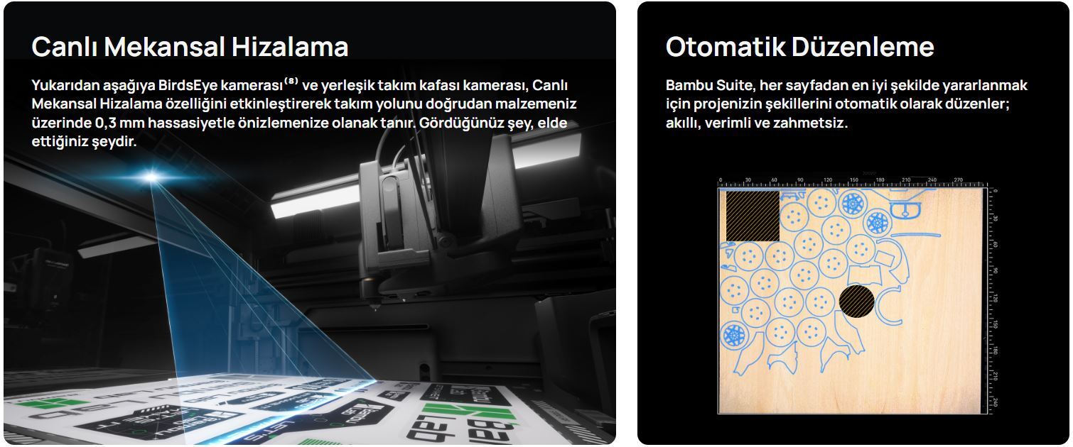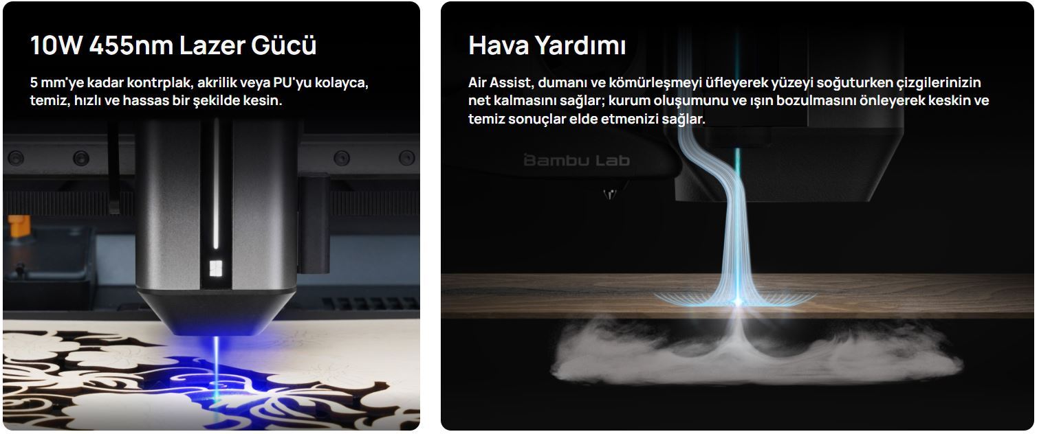 Thanks to its modular design, H2S can be expanded with 10 W laser engraving (Laser Edition or upgrade kit), blade cutting, and pen plotting tools. The laser solution offers safe, consistent, and precise processing with rapid visual positioning, automatic focus/height measurement via micro LiDAR, flame/door/temperature monitoring, and an overall Class 1 safety architecture. This makes it possible to combine printing + engraving/cutting workflows on a single platform, from prototyping to finished products.