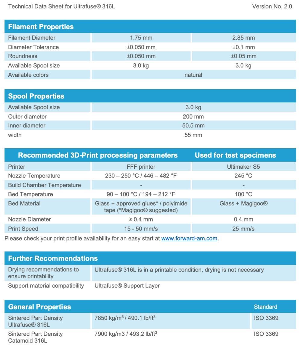 BASF Forward AM Ultrafuse 316L Technical Specifications: