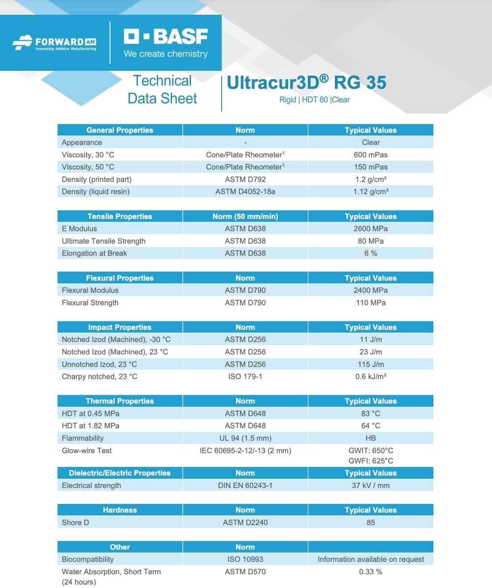 BASF Ultracur3D RG 35 is a methacrylate-based professional resin that offers high hardness and rigidity. Its transparent structure makes it ideal for producing detailed parts requiring optical clarity. With low shrinkage, high dimensional accuracy, and superior surface quality, it provides reliable results for engineering parts, prototypes, and functional applications.