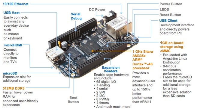 It has 1 GHz processor, 512 MB DDR3 internal RAM, Linux Debian preloaded internal 4 GB memory, µHDMI connection for sound and video out on it. DC 5V adapter input, GPIO pins, microSD memory card input and USB outputs are the features which increases the BeagleBone's ease of use.