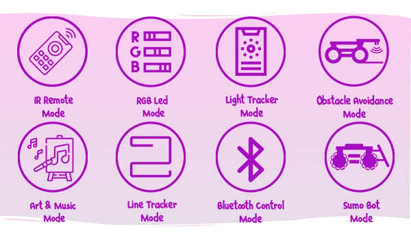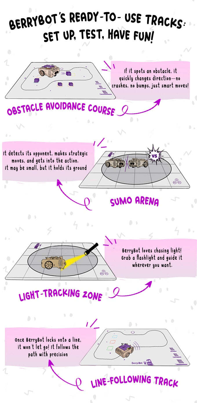 With the tracks included in the kit, you can quickly create common projects such as line following, sumo, light tracking, and obstacle-avoiding robots using the mobile application. Alternatively, you can learn how the algorithms for these projects are developed and write the code using the PicoBricks IDE. Additionally, you can organize fun activities with your friends by completing the tasks in the booklet or creating your own tasks based on your imagination, using the other track included in the kit.