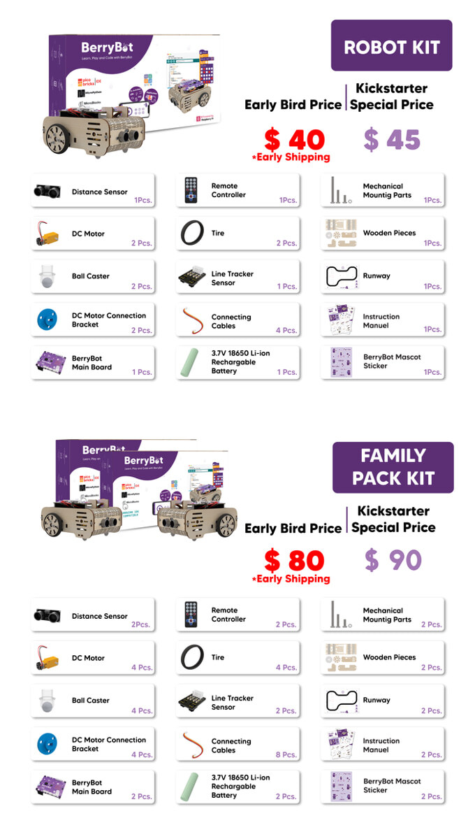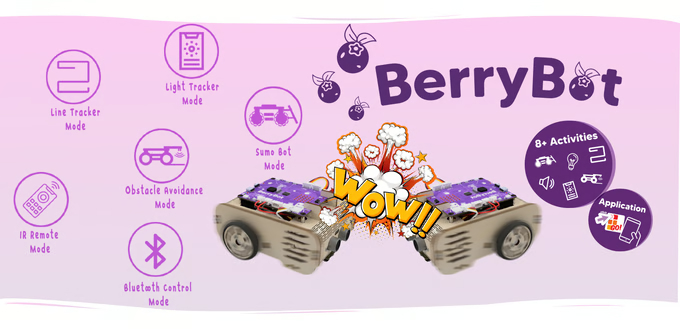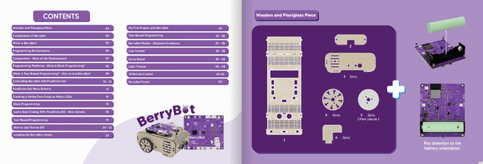 BerryBot is a robotic programming kit that aims to develop children's skills in robotics infrastructure, basic programming, hand-arm coordination, problem-solving, and more. Thanks to the motherboard on the kit, the motor connections that enable the robot to move physically can be made quickly. The robot's mechanical and electronic setup can be completed in a short time due to its easily assembled wooden body.