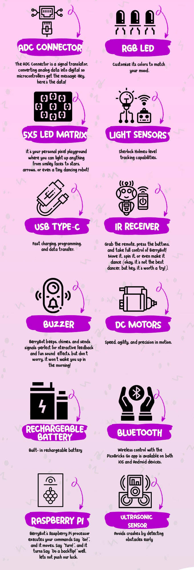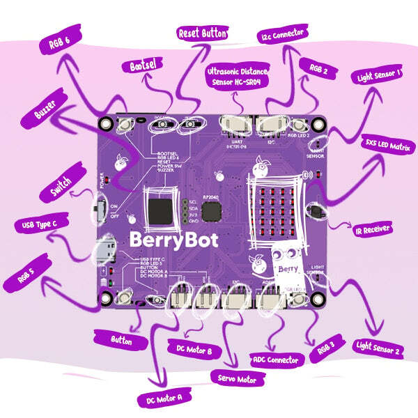 BerryBot houses more than 25 input and output sensors on its main board. Thanks to its components, BerryBot transforms into a project development robot that you can customize by developing your own code.