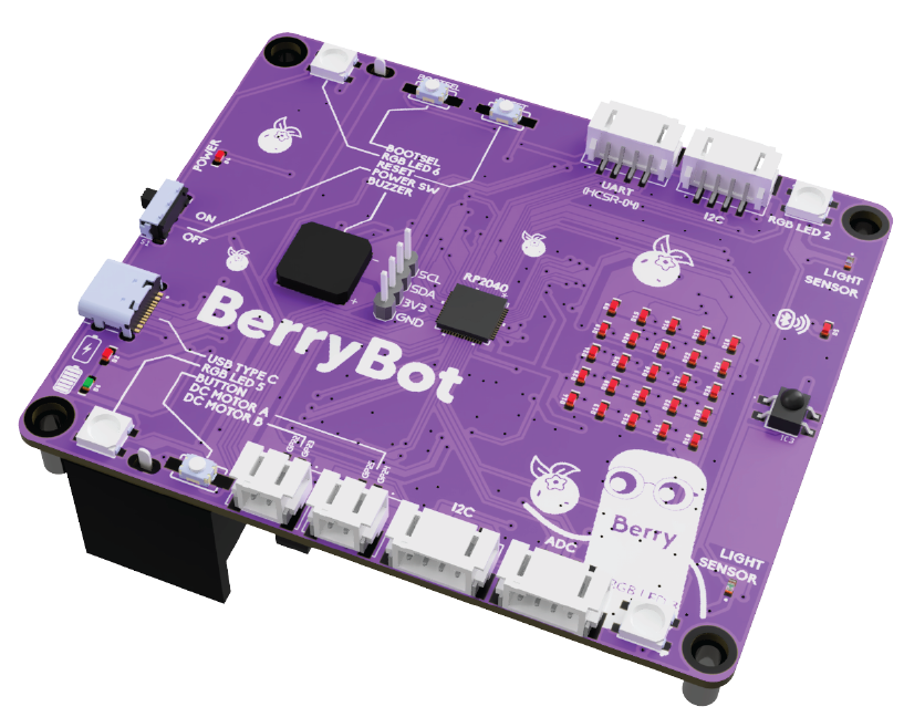 BerryBot houses more than 25 input and output sensors on its main board. Thanks to its components, BerryBot transforms into a project development robot that you can customize by developing your own code.
