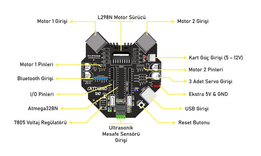 Thanks to RJ11 type motor inputs on Catduino, you can easily connect the motors to the board. Karboard provides convenience for anyone who wants to explore the Arduino world and develop projects.
