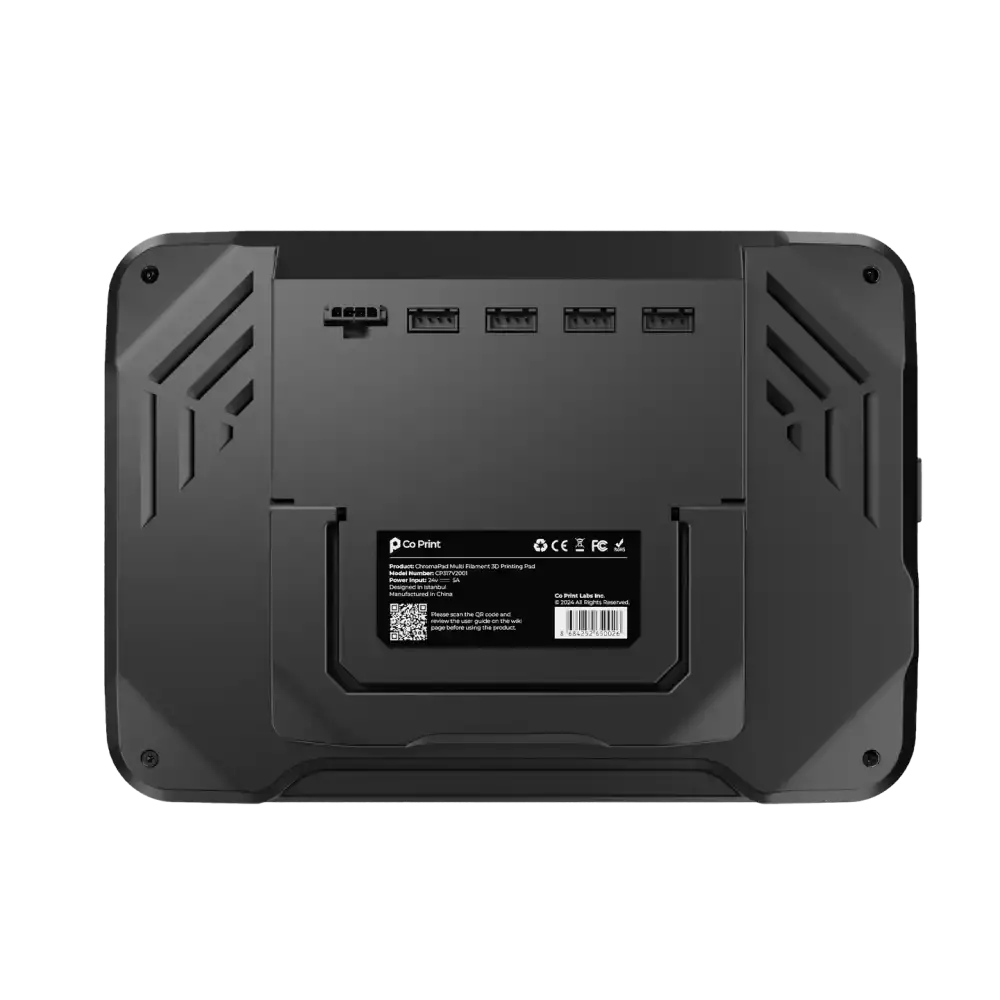 ChromaPad'in sağ tarafında 3 adet USB portu bulunmaktadır. Bu portlar 3D yazıcılar ve Input Shaper gibi sistemleri bağlamak için kullanılabilir. Arkada, araç başlığı kontrolünü sağlayan bir ChromaHead soketi bulunurken, ekstruderleri yönetmek için 4 ekstruder yuvası sağlanmıştır. Tabletin sol tarafında bir güç düğmesi ve bir güç yuvası bulunmaktadır.