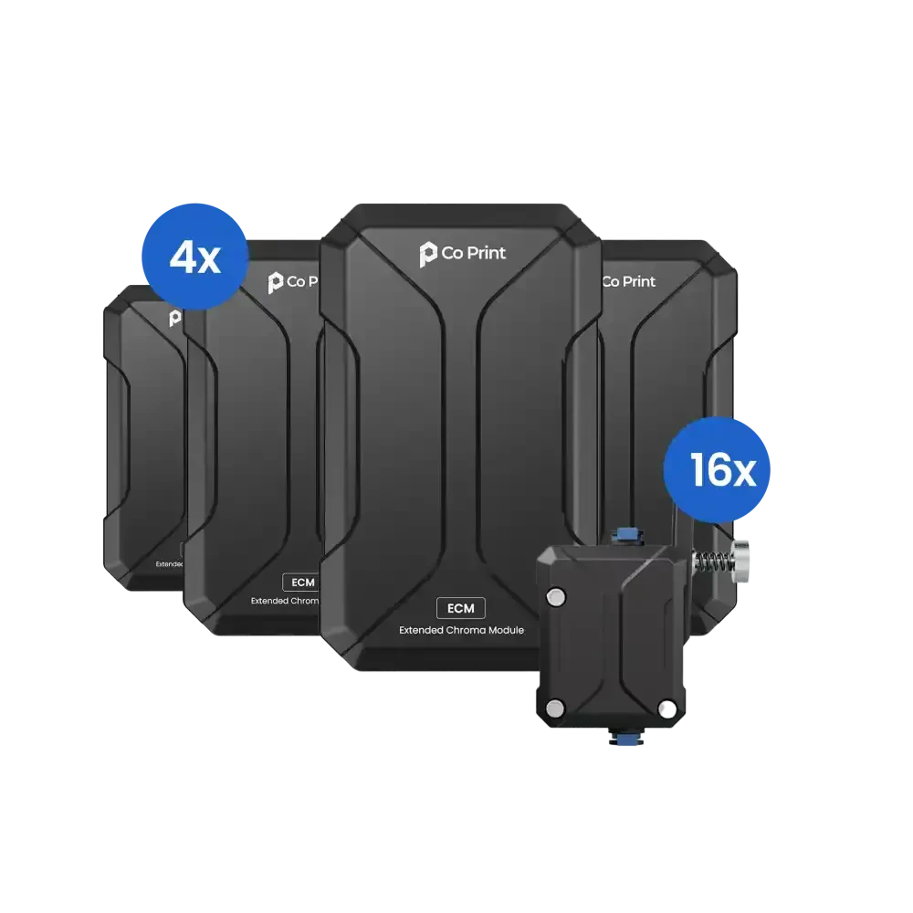 ECM stands for Extended Chroma Module, designed to enhance your ChromaSet or KCM Set by adding control for 4 additional extruder motors. By connecting the ECM to your set using a Type-C connection, you can attach 4 extruder motors to the ECM. Thus, our set, which comes standard with control for 4 extruders, can manage 8 extruders with one ECM, allowing you to print with 8 different filaments.