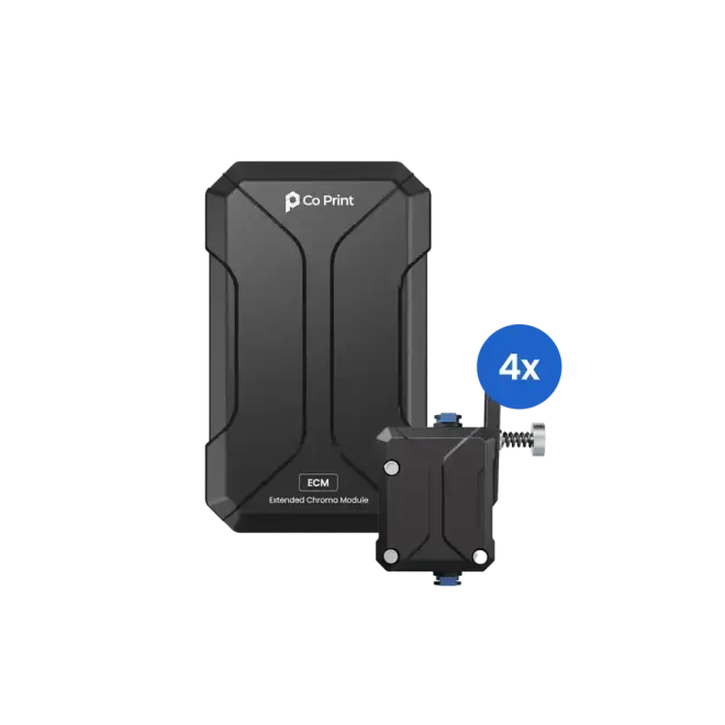 ECM stands for Extended Chroma Module, designed to enhance your ChromaSet or KCM Set by adding control for 4 additional extruder motors. By connecting the ECM to your set using a Type-C connection, you can attach 4 extruder motors to the ECM. Thus, our set, which comes standard with control for 4 extruders, can manage 8 extruders with one ECM, allowing you to print with 8 different filaments.
