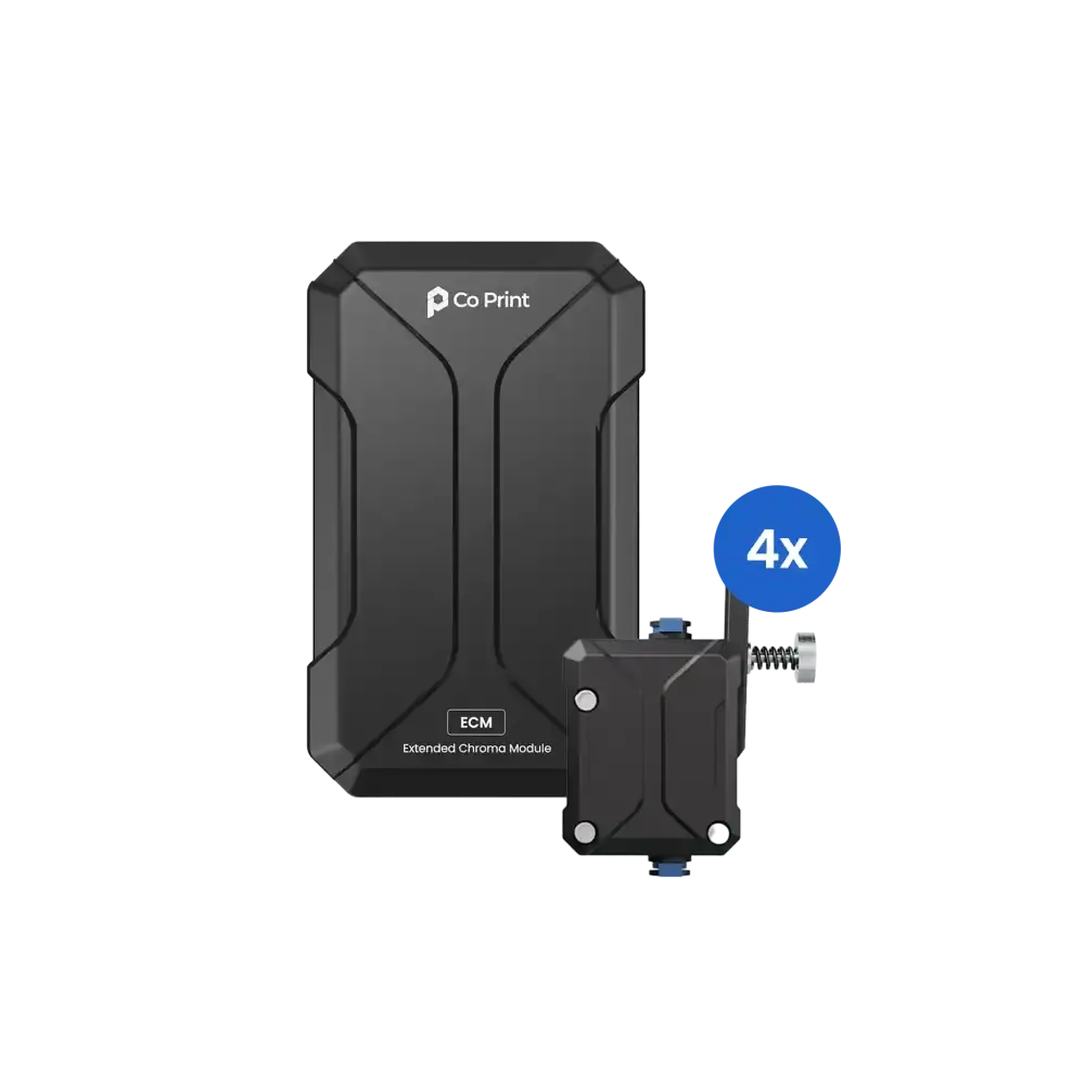 ChromaSet ve KCM ile birden fazla ECM kullanmak mümkündür. Bu sayede, setlerimiz toplamda 20 Extruder kontrol edebilir, böylece tek bir baskıda 20 farklı malzeme kullanarak çok renkli baskılar oluşturabilirsiniz.