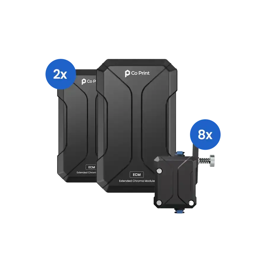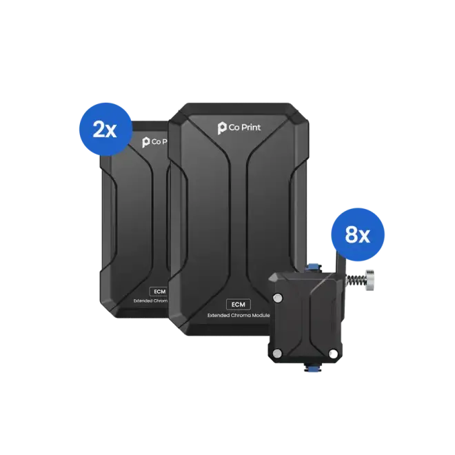 ECM stands for Extended Chroma Module, designed to enhance your ChromaSet or KCM Set by adding control for 4 additional extruder motors. By connecting the ECM to your set using a Type-C connection, you can attach 4 extruder motors to the ECM. Thus, our set, which comes standard with control for 4 extruders, can manage 8 extruders with one ECM, allowing you to print with 8 different filaments.