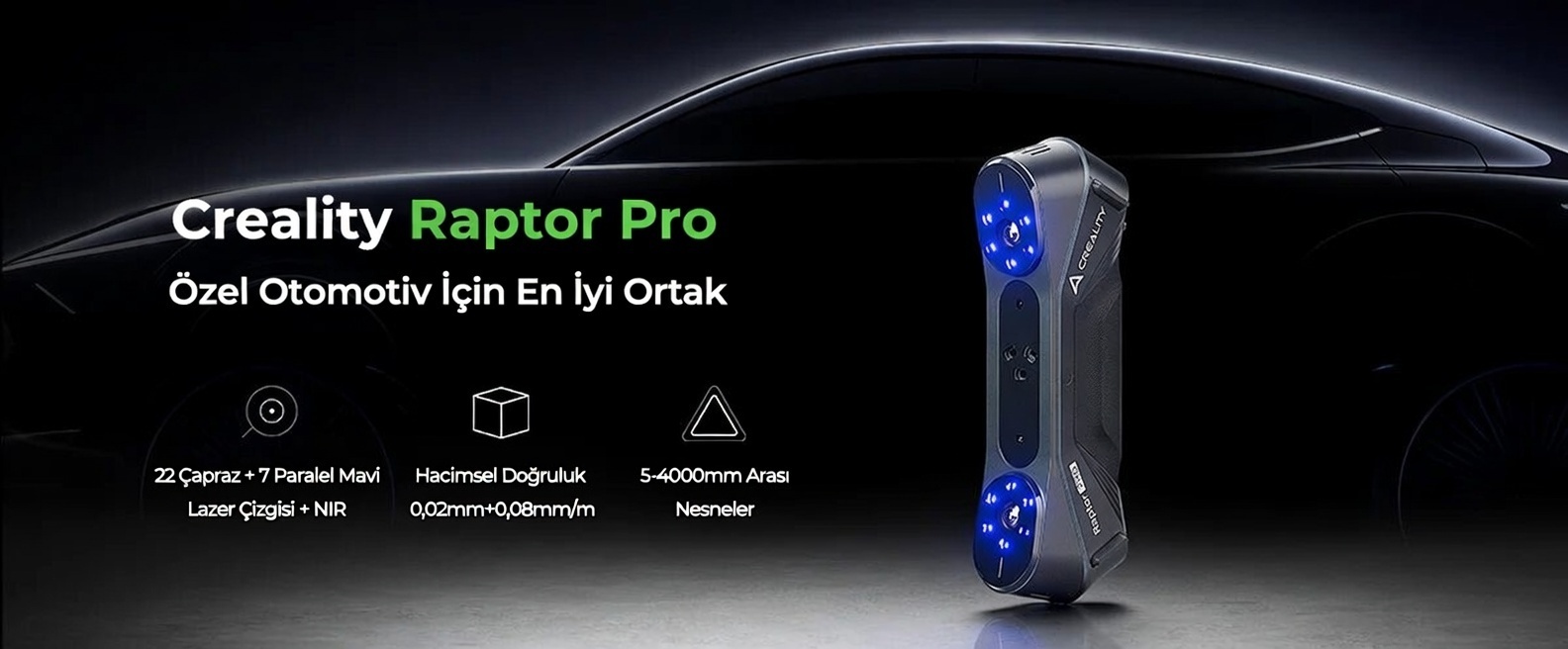 Creality CR-Scan Raptor Pro, profesyonel kullanım odaklı geliştirilmiş; yüksek detay, hızlı tarama ve güçlü takip performansı sunan ileri seviye bir 3D tarayıcıdır. Küçük parçaların ince detaylarından büyük objelerin genel geometrisine kadar geniş bir kullanım senaryosunda; tersine mühendislik, ürün geliştirme, otomotiv, bakım-onarım ve 3D baskı öncesi modelleme süreçlerinde yüksek verimlilik sağlar.
