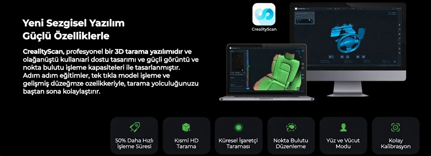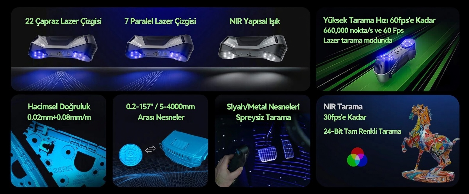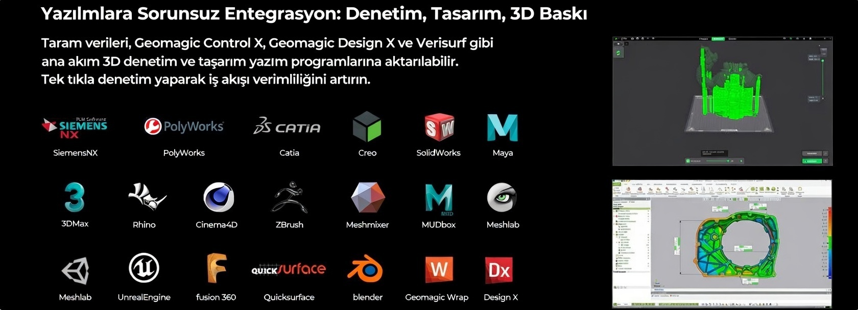 Kullanım Alanları: Tersine mühendislik, ürün geliştirme, otomotiv, bakım-onarım, 3D baskı öncesi modelleme