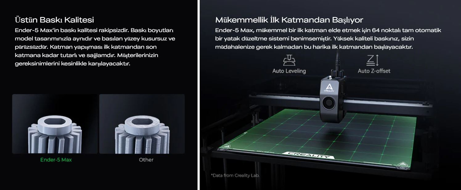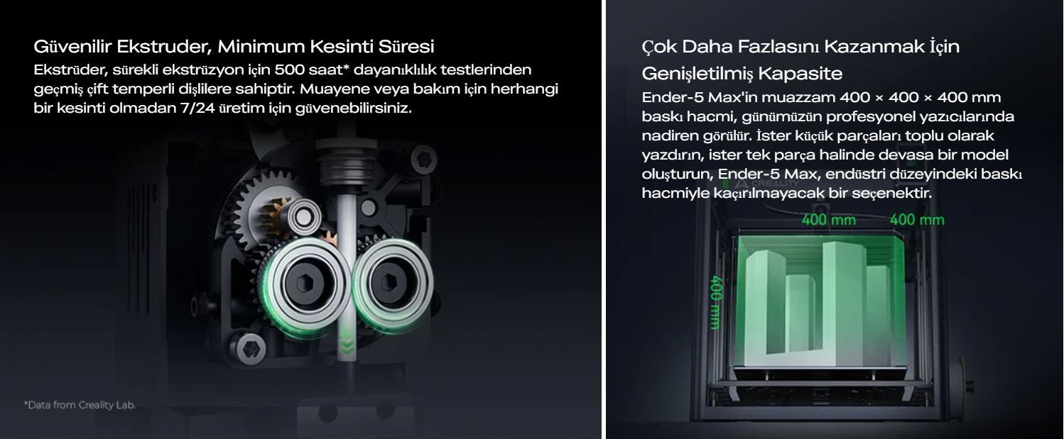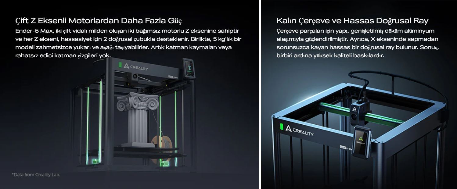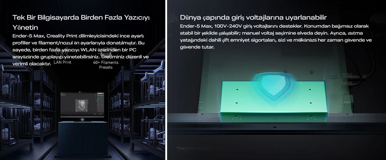 With dual Z-axis motors, a precision linear rail system, and a die-cast aluminum frame, the Ender-5 Max maintains outstanding layer consistency and stability throughout the entire print. The 1000W fast-heating bed, wide operating temperature range, and durable extruder system make it ideal for uninterrupted 24/7 production.