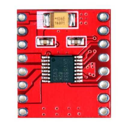 DRV8833 Step Motor Sürücü Kartı, ayarlanabilir akım kontrolü yapabilen, sıcaklık ve akım koruması bulunan bir karttır. Üzerinde bulunan ayarlanabilir akım kontrolü sayesinde kart, üzerindeki potansiyometre ile maksimum akımı ayarlayabilir ve motorun nominal voltajından daha yüksek voltajlar uygulayarak step hızını artırabilirsiniz. Step motor uygulamalarında ve 3D yazıcı uygulamaları için uygun bir sürücü kartıdır.