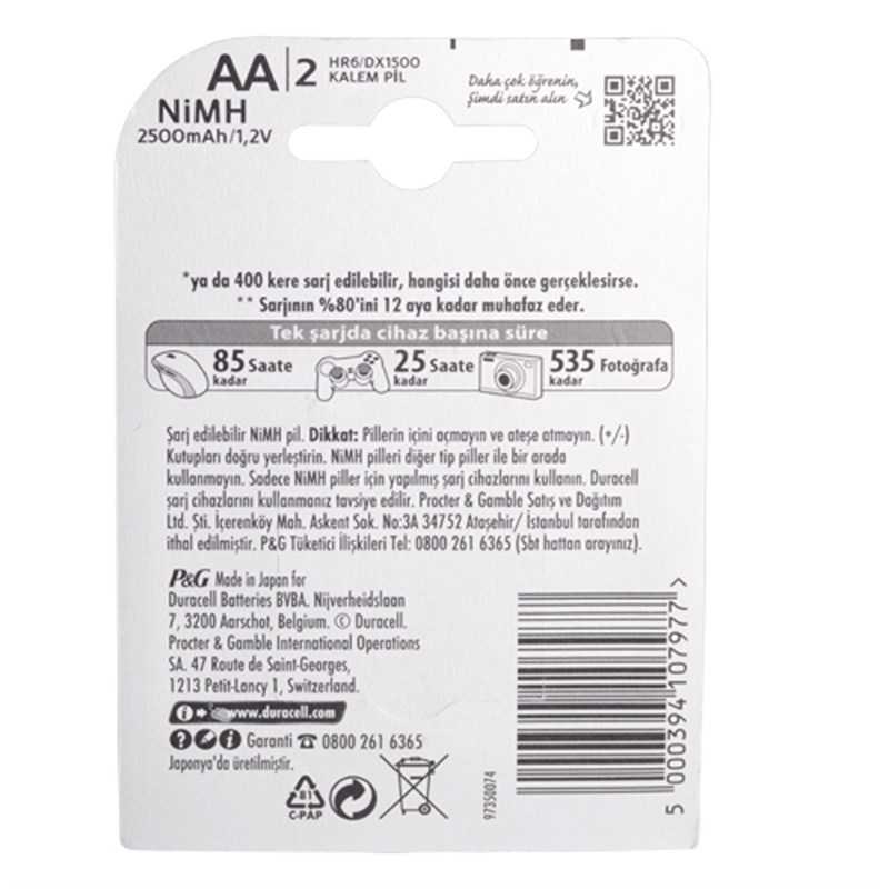 | Özellikleri | Duracell Şarj edilebilir pil, Duracell Yüksek performanslı pil, Duracell Dijital fotoğraf makinalarında & mp3 oynatıcılar için uygun bir tercih, Alkalin pile oranla 4 kat daha uzun ömürlü, Şarj Edilmiş Kullanıma Hazır, Duracell'in Duralock Güç Koruma Teknolojisi'yle, uzun ömürlü pilinizin ne zaman isterseniz kullanıma hazır olacağı konusunda içiniz rahat. Duralock, pilinizin kullanılmadığı durumda 10 yıl tam güç kalabilmesi için yapılmış özel bir güç koruma sistemidir. |