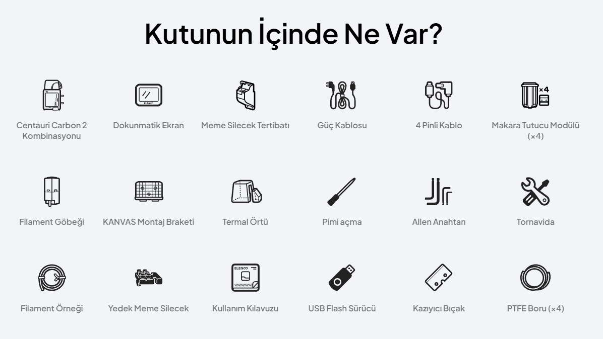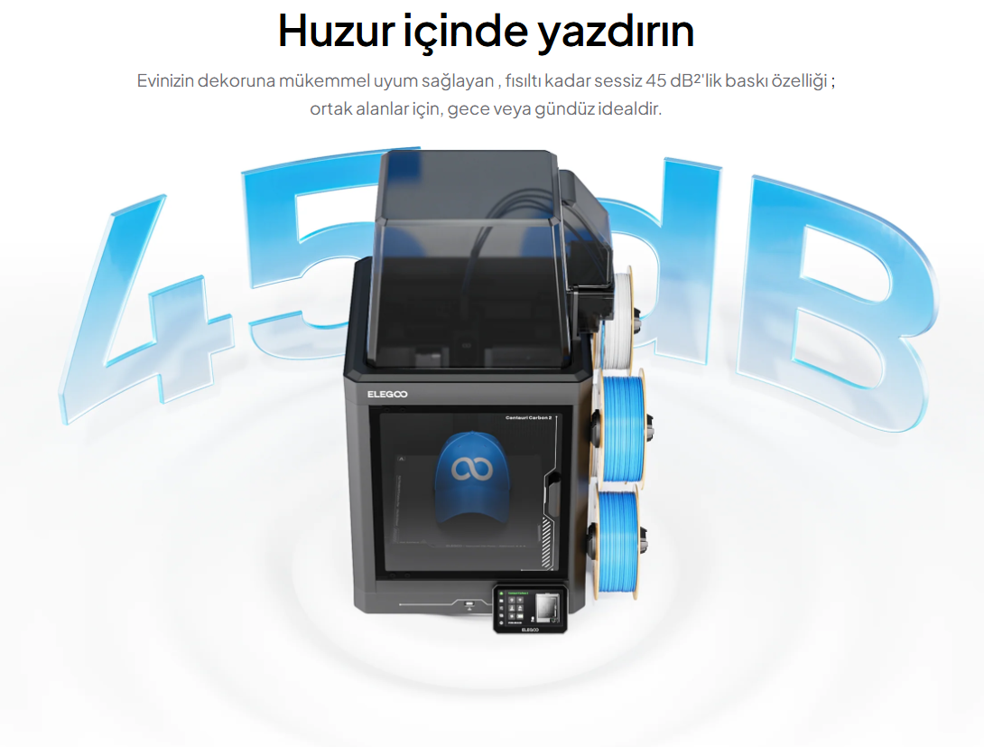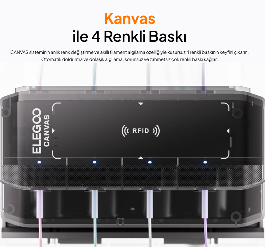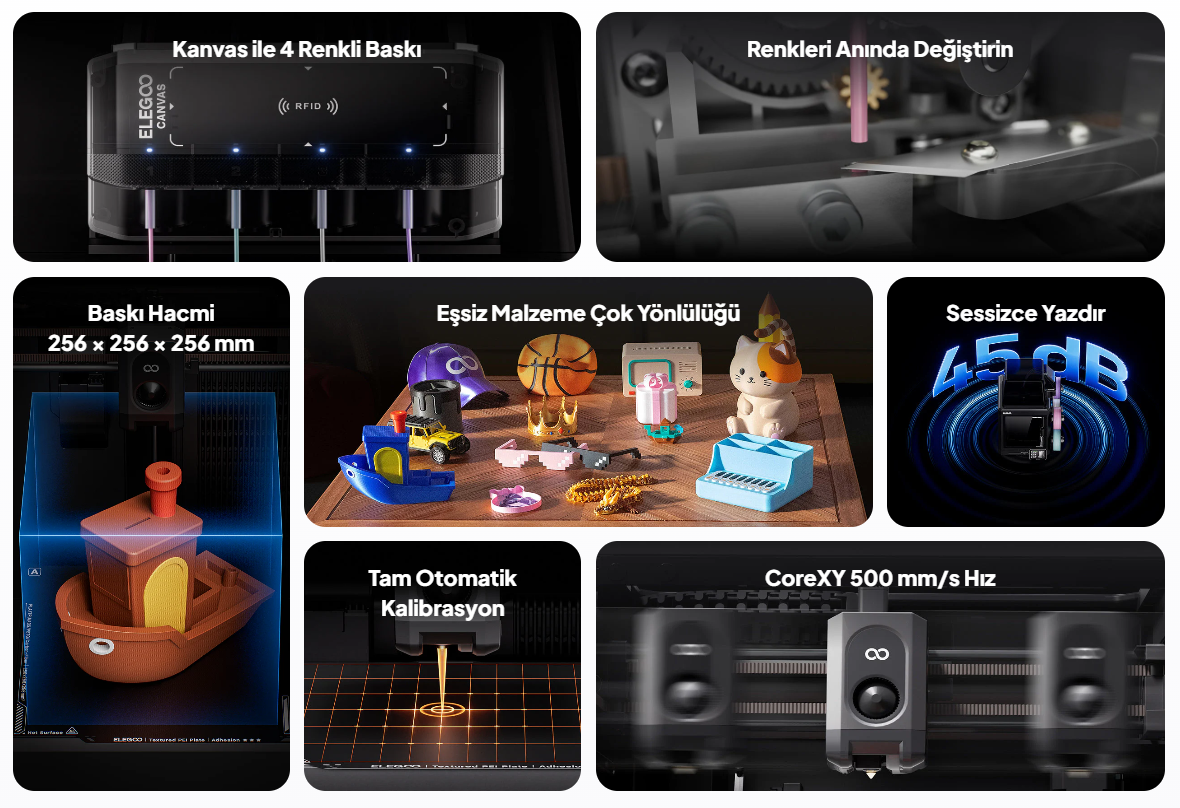 The ELEGOO Centauri Carbon 2 Combo is an enclosed FDM 3D printer that stands out with its high-speed CoreXY motion system, and thanks to the CANVAS multicolor printing system, it can produce up to 4 colors in a single print. With a 256 x 256 x 256 mm build volume; a nozzle structure resistant up to 350°C, a 110°C heated bed, an intelligent sensor infrastructure, and features such as fully automatic calibration/bed leveling, it offers a comprehensive platform for both beginners and performance-focused users.