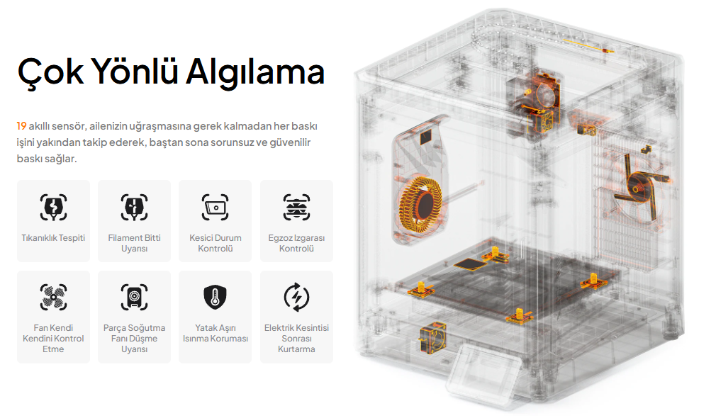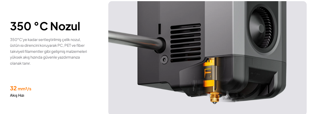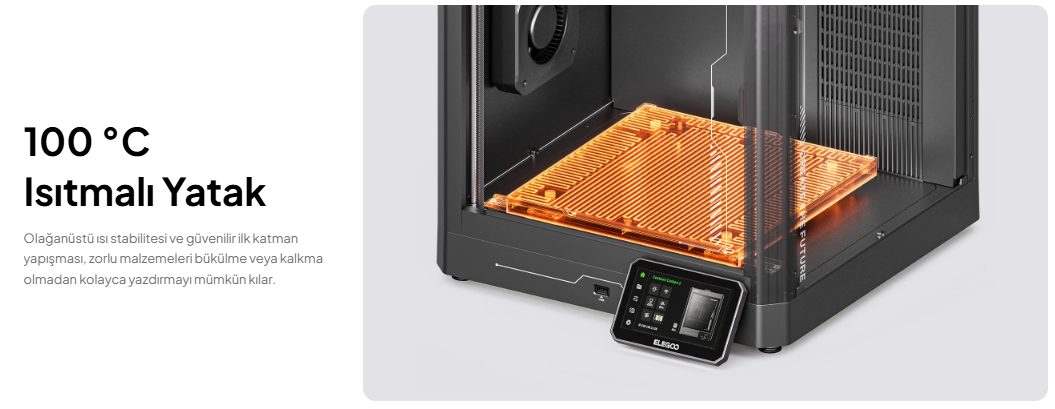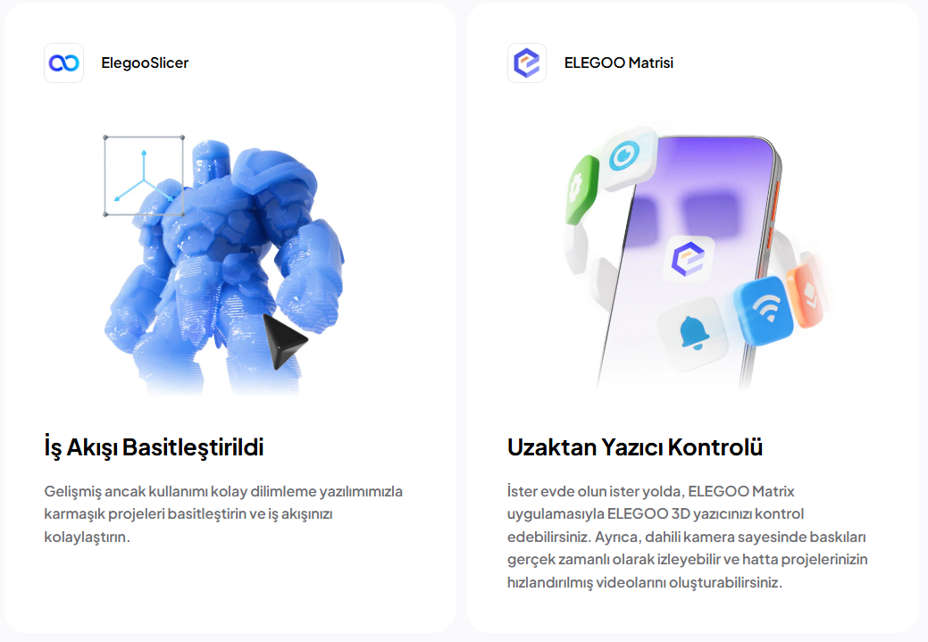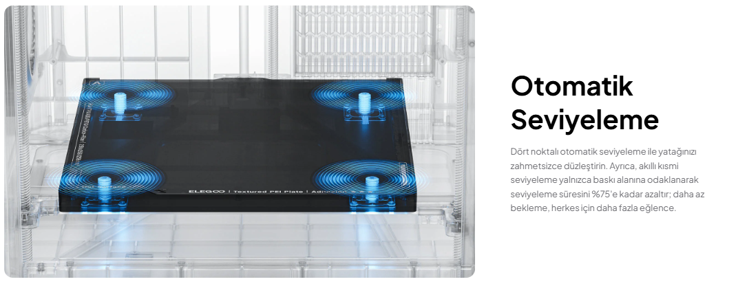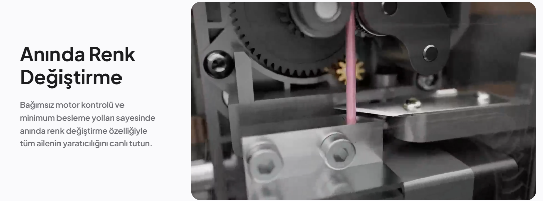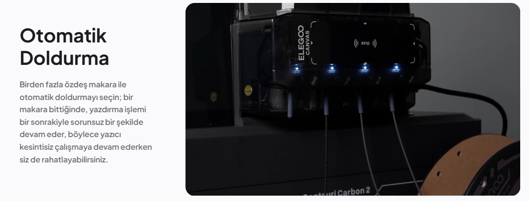 The ELEGOO Centauri Carbon 2 Combo is an enclosed FDM 3D printer that stands out with its high-speed CoreXY motion system, and thanks to the CANVAS multicolor printing system, it can produce up to 4 colors in a single print. With a 256 x 256 x 256 mm build volume; a nozzle structure resistant up to 350°C, a 110°C heated bed, an intelligent sensor infrastructure, and features such as fully automatic calibration/bed leveling, it offers a comprehensive platform for both beginners and performance-focused users.