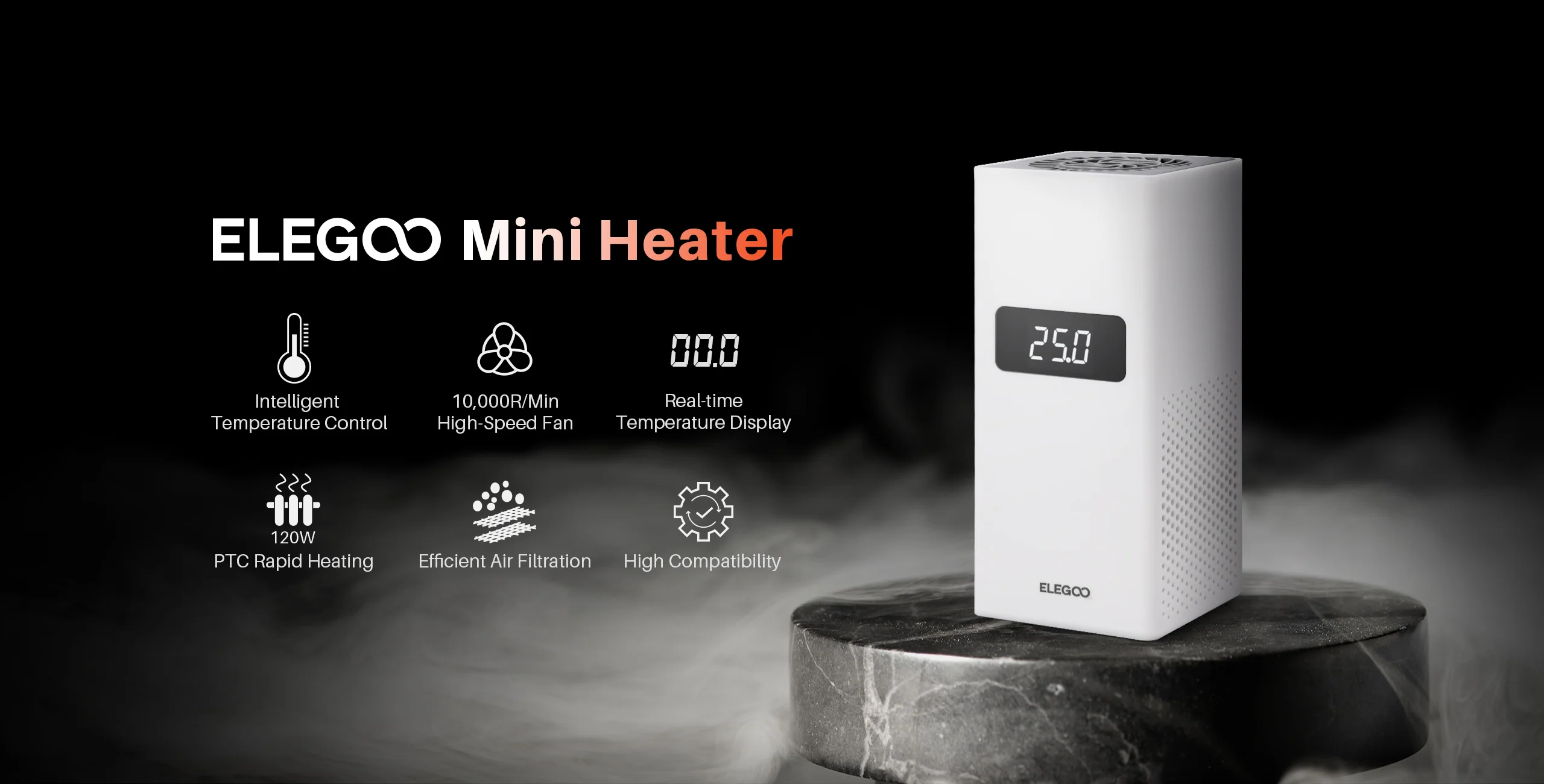 The Elegoo Mini Heater Air Circulator features precise and intelligent temperature control that guarantees optimum stability from start to finish. Say goodbye to annoying problems like mid-print separation, warping, and poor interlayer adhesion that hinders your progress. Forget about manual adjustments and temperature fluctuations. The Mini Heater’s automatic heating function intelligently engages below 25℃ and disengages above 25℃, ensuring continuous temperature optimization. Focus on your creativity while the intelligent temperature control takes care of the rest. Experience the power of fast and efficient printing with the Mini Heater’s advanced PTC heating technology. Watch in amazement as the chamber temperature quickly rises to 25°C, allowing you to dive into your printing projects with unprecedented speed. But that’s not all. Combined with its 120W ultra-high power, the Mini Heater can also achieve exceptional energy efficiency by reducing power consumption without compromising heating performance. What’s more, with the self-regulating properties of the PTC element, you can rest assured knowing that overheating is prevented, providing enhanced safety throughout your operation. Embrace the combination of cleanliness and precision with the Mini Heater, which features an efficient air filtration system, thus removing dirt and ensuring a clean and purified printer chamber. The Mini Heater has a user-friendly design that provides a seamless and enjoyable experience from unboxing to printing your first masterpiece. With the simple installation process, you can easily set it up and start your printing journey with confidence.