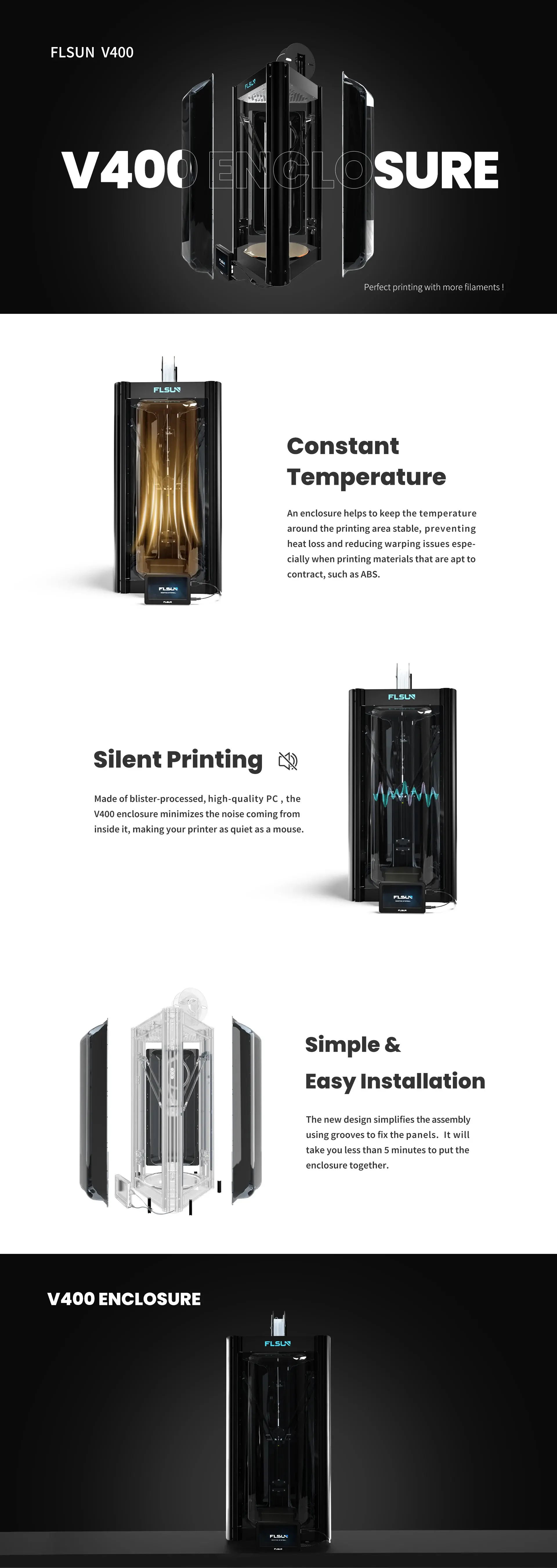 The FLSUN V400 Enclosure is a fully enclosed protective housing specifically designed for the high-speed delta 3D printer FLSUN V400. By stabilizing the internal ambient temperature during printing, it enables higher-quality, warp-free, and more consistent results, especially when working with engineering-grade filaments such as ABS, ASA, and Nylon. It also helps isolate dust, odors, and external factors, improving both user safety and print quality.