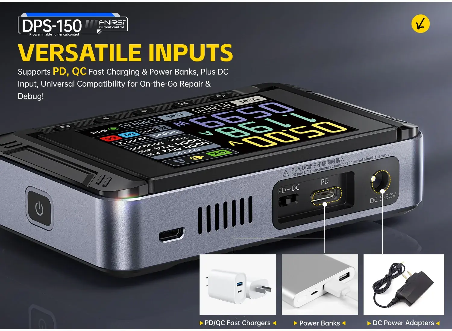 Power input options: PD fast charger, QC fast charger, power bank, DC power adapters