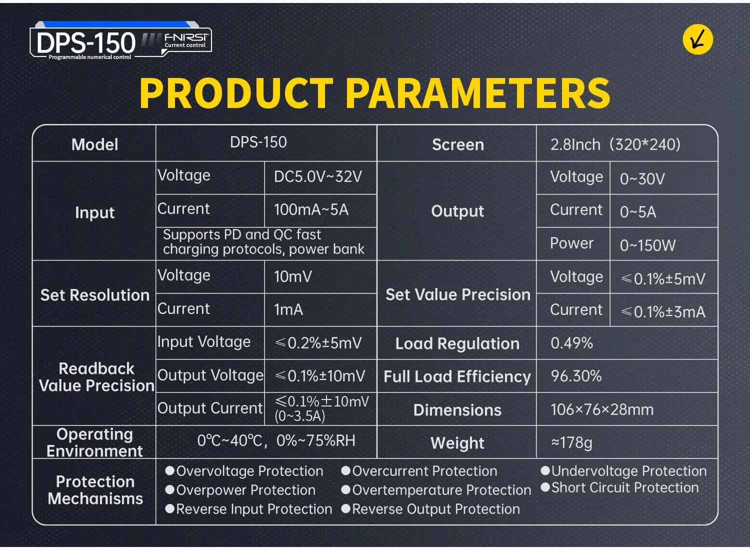 Fnirsi DPS150 Adjustable DC Programmable Power Supply Technical Specifications: