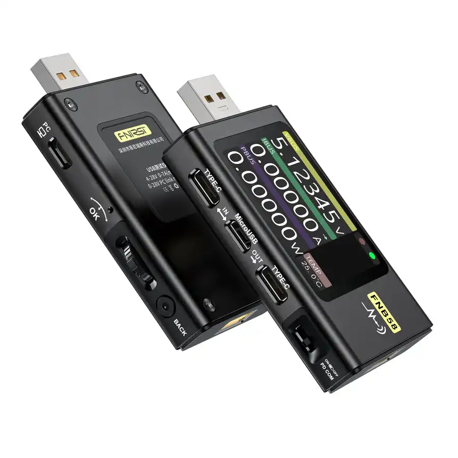 Fnirsi FNB58, USB üzerinden çalışan cihazların voltaj, akım, güç, kapasite ve enerji tüketimini detaylı şekilde ölçmek için tasarlanmış gelişmiş bir USB test cihazıdır. Renkli IPS ekranı ve yüksek ölçüm hassasiyeti sayesinde şarj adaptörleri, powerbank’ler, kablolar ve USB tabanlı elektronik cihazların performansını analiz etmek için ideal bir çözümdür.