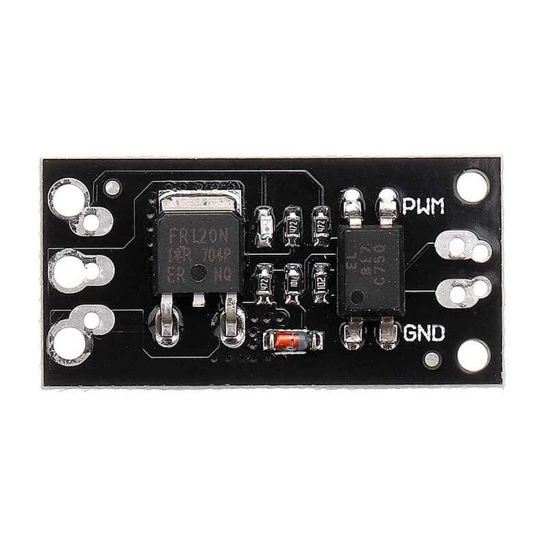 Notify me when its in stockThe FR120N Mosfet driver board has been developed for use in high current switching applications. Safe operation is possible with optocoupler isolation. MCU and Arduino control board are compatible with 3V or 5V signals. It can set high level start, low level stop, PWM speed. It is widely used to control the starting and stopping of the motor, solenoid valve and other connected equipment. The signal input side can be welded to the compatible breadboard or the pin itself. The output can be soldered to the terminal or directly to the wire.