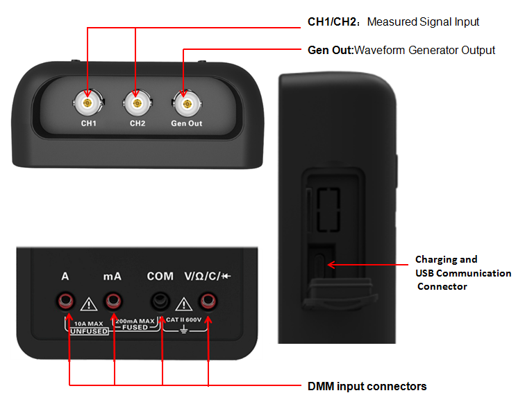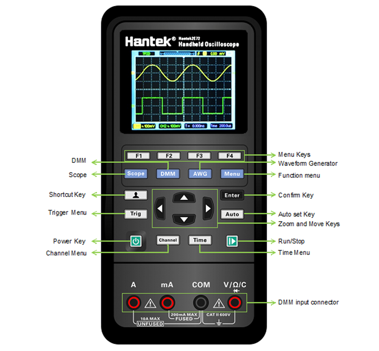 The Hantek 2D72 is a multifunction handheld measurement device that combines a 70MHz digital oscilloscope, a 6000-count digital multimeter, and a built-in signal generator in a single compact and portable unit. It is an ideal solution for field service, maintenance and repair tasks, educational use, and laboratory applications.