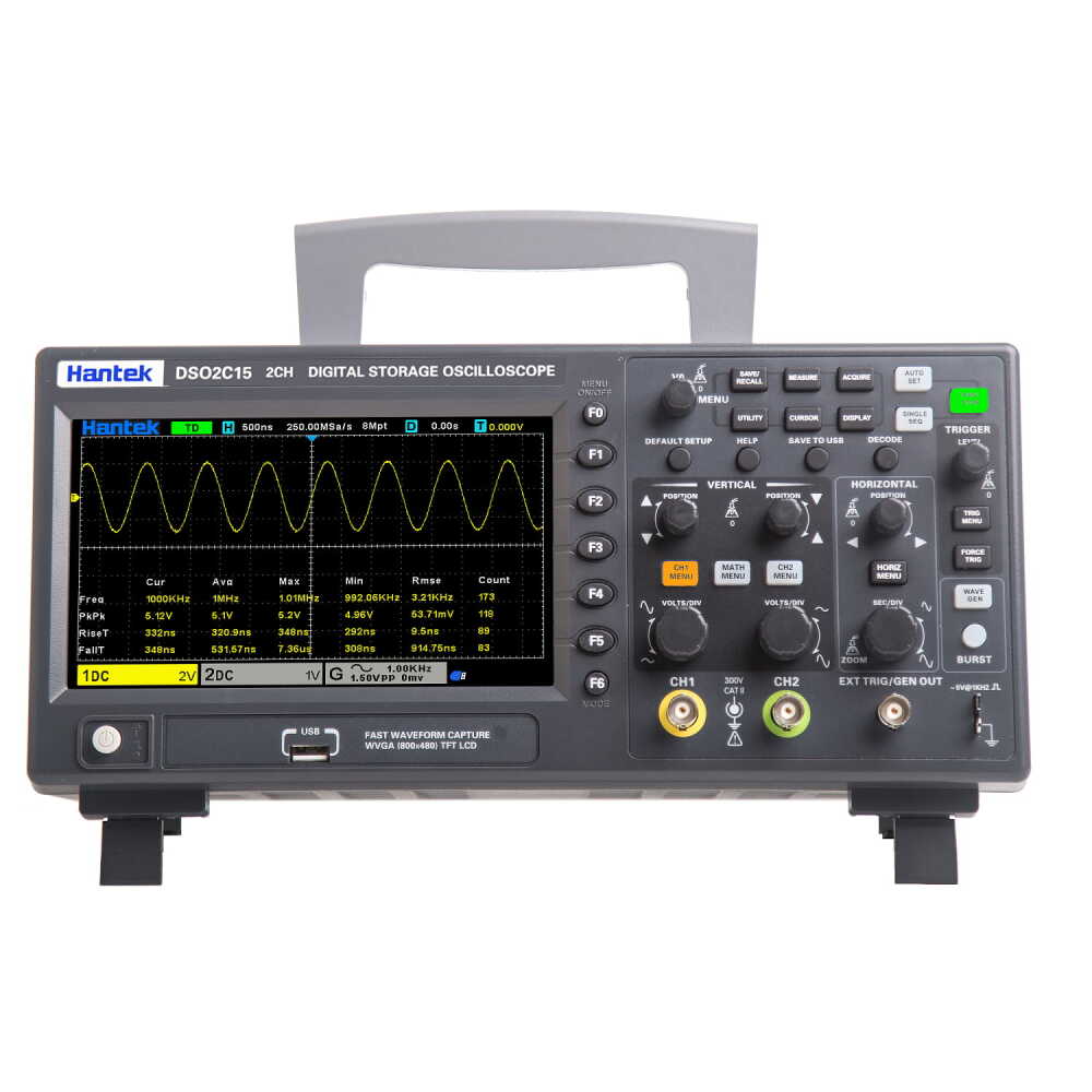 Hantek DSO2C15; 150MHz analog bant genişliği, 2 kanal yapısı ve 1GSa/s örnekleme hızı ile yüksek hızlı sinyal analizine ihtiyaç duyulan elektronik tasarım, bakım-onarım, eğitim ve Ar-Ge uygulamaları için geliştirilmiş kompakt bir dijital depolama osiloskobudur. Geniş bant genişliği sayesinde daha hızlı yükselme sürelerine sahip sinyallerin doğru ve kararlı şekilde görüntülenmesine olanak tanır.