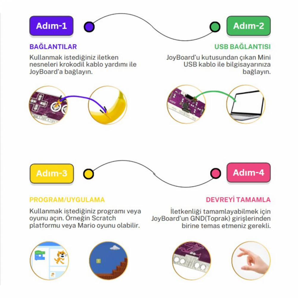 Gelince Haber VerJoyBoard özellikle okul öncesi ve ilk okul çağındaki çocuklar için tasarlanmış eğlenceli bir robotik kodlama kartıdır. Kullanımı oldukça kolay olup birçok oyun ve uygulama yapabilirsiniz. JoyBoard hemen hemen herşeyi klavyenizdeki ve farenizdeki tuşlara çevirebilmektedir. Bu sayede meyveler ile piyano çalabilirsiniz.