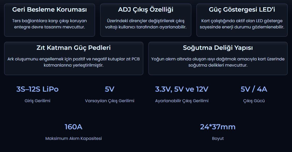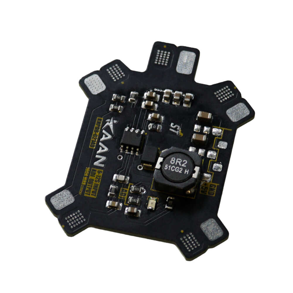 KAAN Power Distribution Board (KNPDB-02140) offers a high performance and reliable power management solution for unmanned aerial vehicles (UAV, multicopter), underwater systems, unmanned marine vehicles and robotic projects. 3S-12S LiPo (11.1V - 44.4V) battery compatibility provides a wide range of applications. The factory set output voltage of 5V can be easily changed to 3.3V, 5V or 12V via ADJ pins. With 160A continuous current capacity and 5V / 4A output power, it offers an ideal infrastructure for powerful systems. Safety and durability are prioritised with feedback protection, advanced pad structure, cooling holes and contrasting layer power pads. Energy status can be monitored instantly with the power indicator LED. With its compact size (24x37mm) and user-friendly design, KAAN Power Distribution Board will be your reliable solution partner in your professional projects.