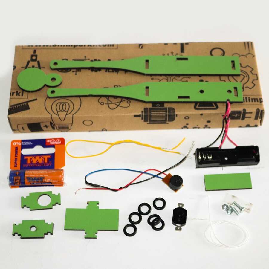 In addition to the design aspect, this set allows children to become familiar with basic circuit components such as a buzzer, battery, battery holder, switch, connection wires, and screws.