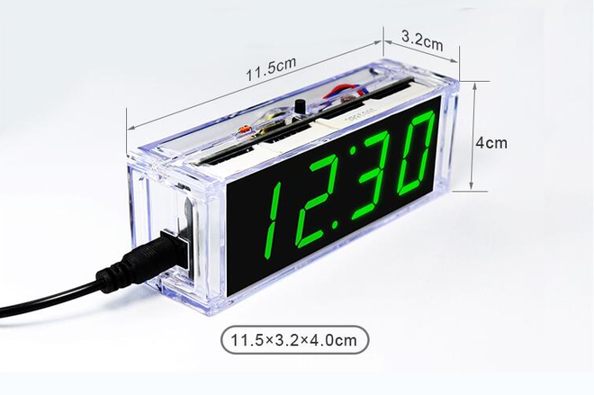 Its dimensions is 105 mm x 46 mm x 29 mm with its ABS plastic transparent housing. It does not only shows the time but also measures and shows the temperature of the enviroment at the same time with its temperature sensor. It does not reset itself even the power cut as its precison RTC IC and clock battery. Additionaly it is an alarmclock and it is able to set the its brightness upon the enviromental light. You can add a