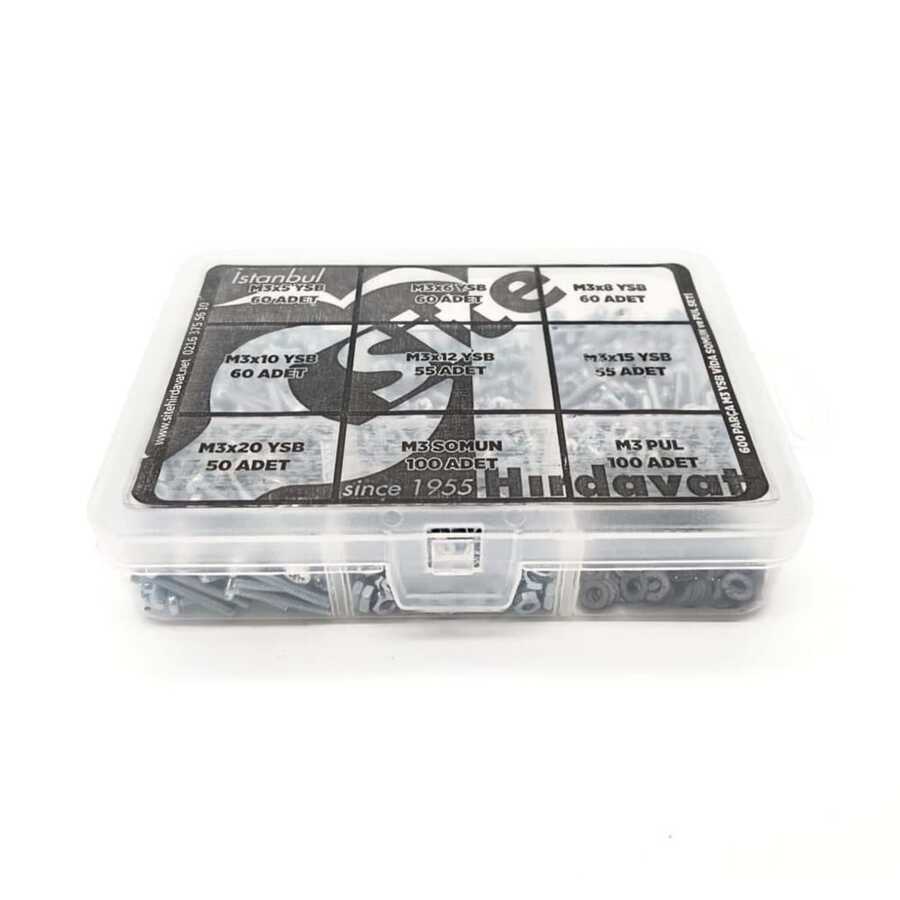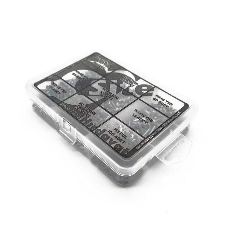 Hobi, elektronik ya da 3B yazıcı projelerinizde kullanabileceğiniz M3 ölçülerine sahip toplamda 600 parça YSB vida, somun ve pul seti.