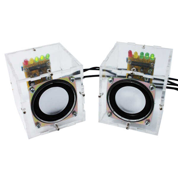 This is a so cute "Make Yourself" speaker set formed by two 70 mm x 70 mm x 76 mm speakers. It has 3W output power for each channel. Diameters of speakers are 50 mm. The fice LEDs on the amplifier circuits shows the amplitude of the voice. It has a very cool look as its transparent acrylic housings.