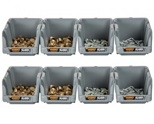 8 piece storage bins including a wall mounting apparatus. This set is grey colored.