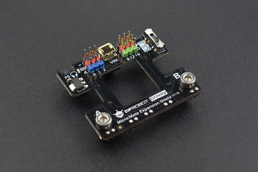 Note: The mounting screws should be well tightened to ensure a secured connection. Micro:Mate only supports 3V (3.3V) analog input from Pin 0, 1, 2. The Micro USB Power port on Micro:Mate cannot be used for data transmission. Components with large power consumption should be connected to Pin 8, 12, 16, with 5V power supply.