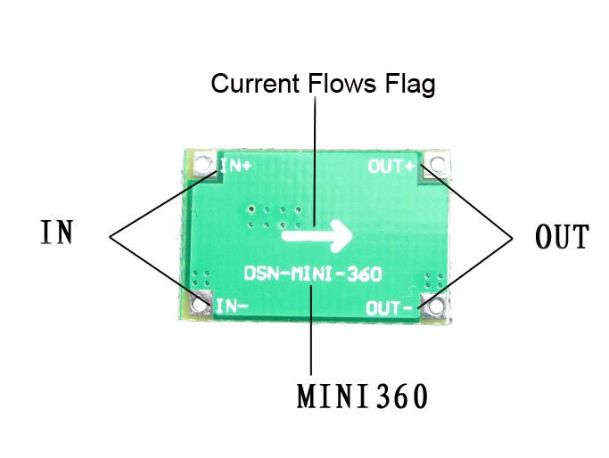 When using this board, the input voltage always must be higher than output voltage. IN+ is positive voltage input, IN- is GND input, OUT+ is positive voltage output, OUT- is GND output.
