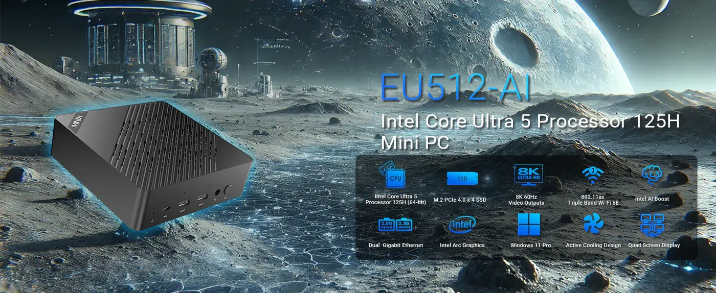 The MINIX Elite EU512-AI delivers maximum performance with minimal footprint on your desk, thanks to its compact design, the latest Intel Core Ultra 5 processor, and integrated Intel Arc graphics. With powerful connectivity options, support for up to 4 displays, high-speed data transfer, and extensive storage capacity, it is the perfect solution for business, creativity, and everyday use. Its modern design and VESA mount support provide both style and efficiency in the office and at home.